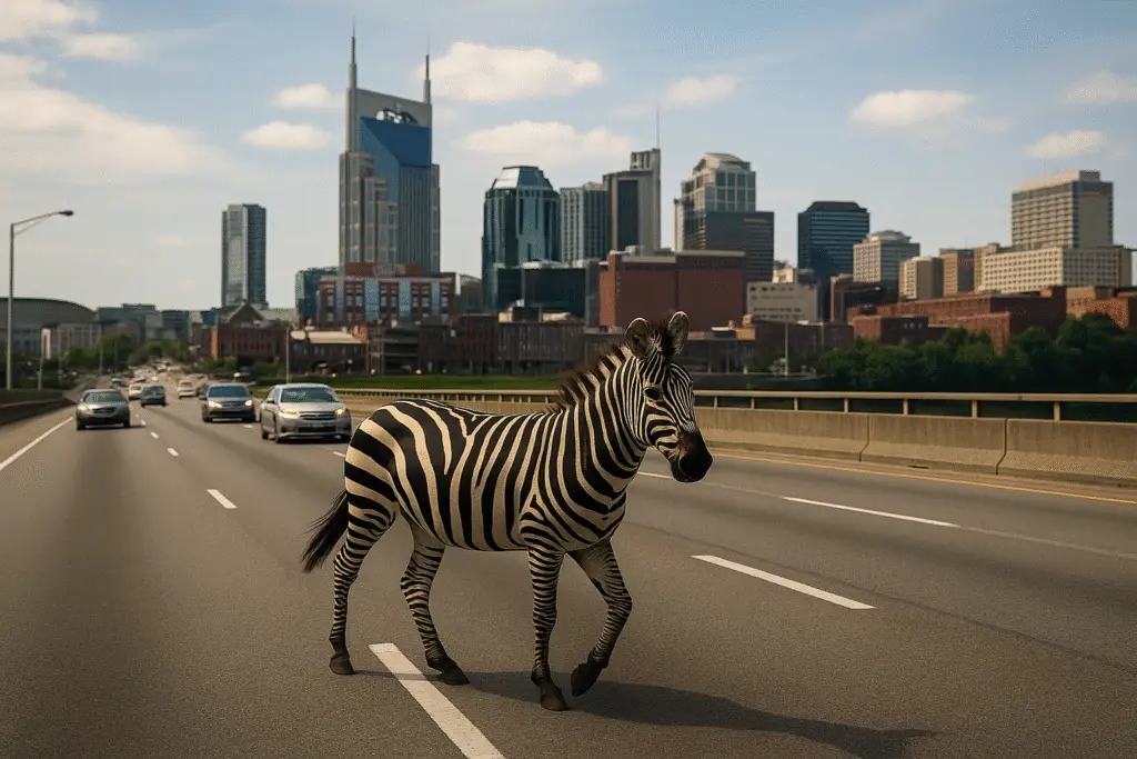 La historia empieza cuando varios residentes reportaron haber visto una cebra caminando libremente por calles residenciales de Murfreesboro. También fue vista cerca de la interestatal de Nashville, lo que generó confusión, sorpresa y, rápidamente, cientos de fotos, videos y memes inundaron las redes sociales y puso a volar la imaginación de múltiples negocios donde la cebra visito supuestamente en montajes con inteligencia artificial.